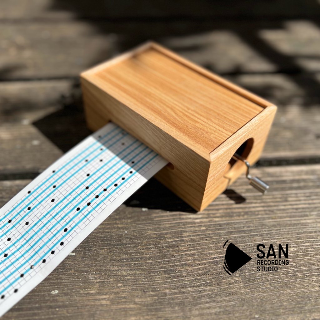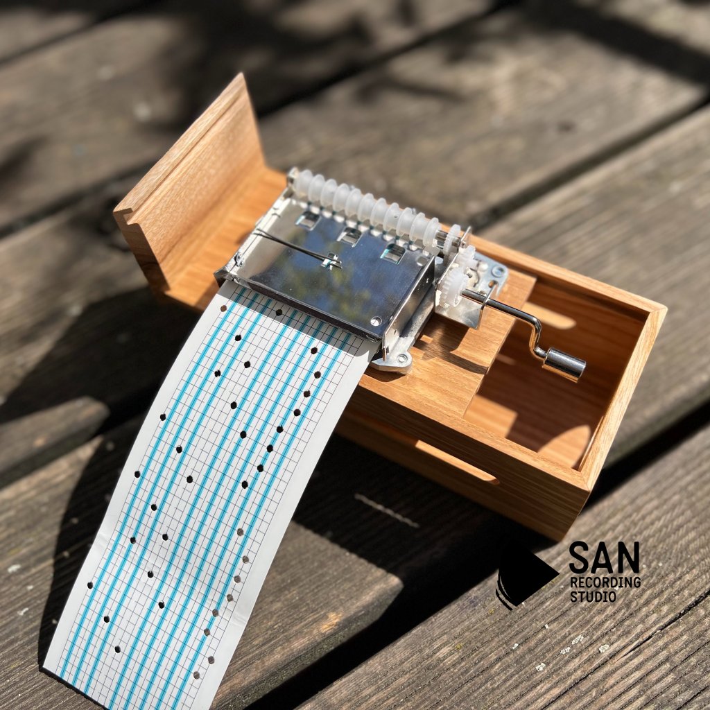 Krásný a jemně znějící hrací strojek s kličkou a papírovou páskou v precizně ručně vyrobené dřevěné krabičce, kde si můžete napsat písničku dle Vaší fantazie.